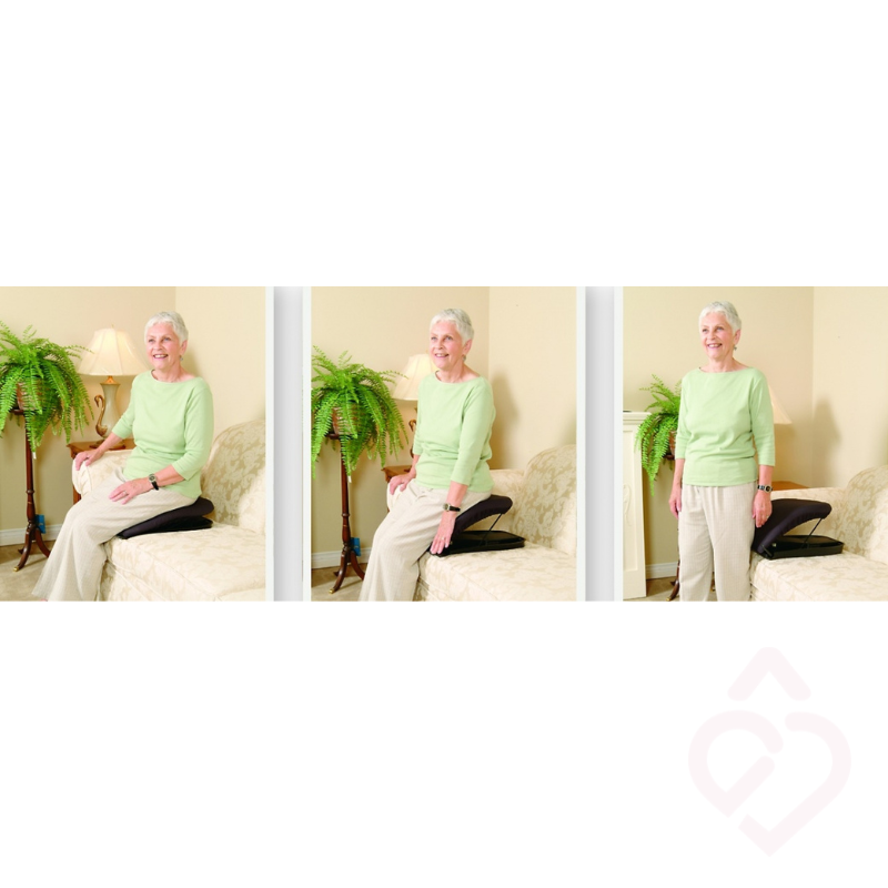 Almofada elevatória para apoio ao levantar indicada para facilitar o movimento de levantar a partir de uma posição sentada. É uma solução mecânica simples que auxilia pessoas com equilíbrio, mas com dificuldade em elevar-se de sofás, cadeirões ou poltronas, reduzindo o esforço físico diário.