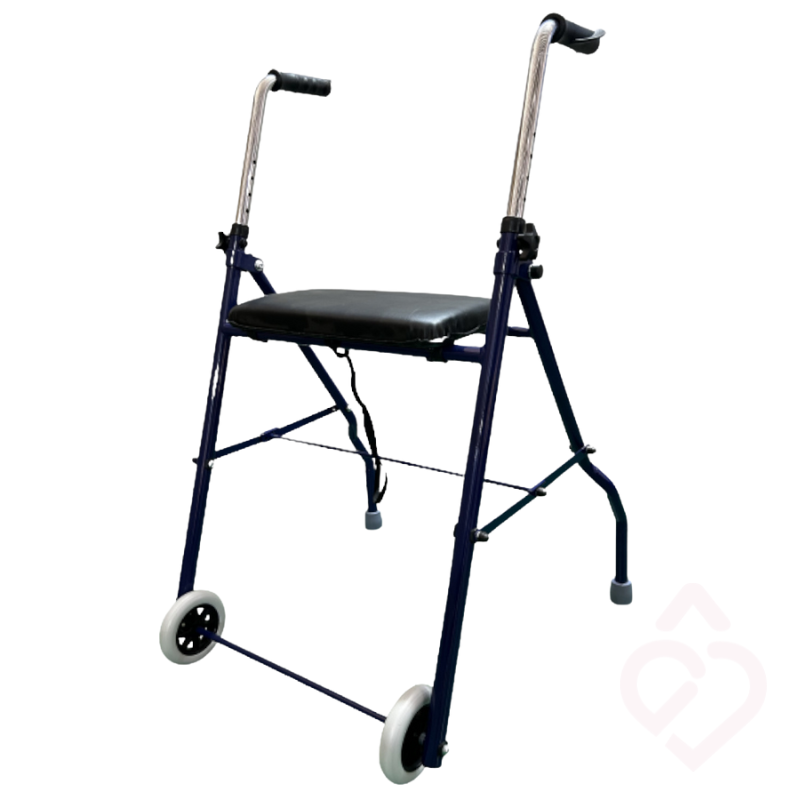Andarilho com 2 rodas e banco – Composto por duas rodas dianteiras e duas ponteiras traseiras em borracha, que garantem estabilidade e equilíbrio. Promove uma marcha mais natural, com o corpo ereto.