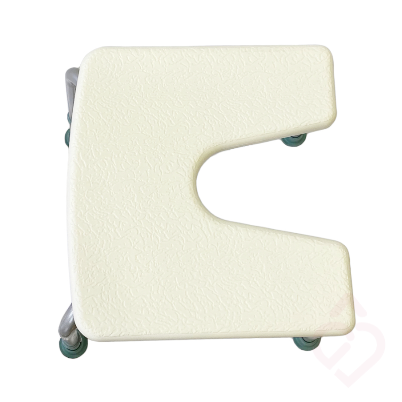 O assento em forma de U facilita a higiene íntima e a superfície antiderrapante oferece maior segurança, mesmo quando molhada. As pernas com ponteiras antiderrapantes e ligeiramente inclinadas garantem boa estabilidade, enquanto a altura regulável permite adaptar o banco às necessidades do utilizador.