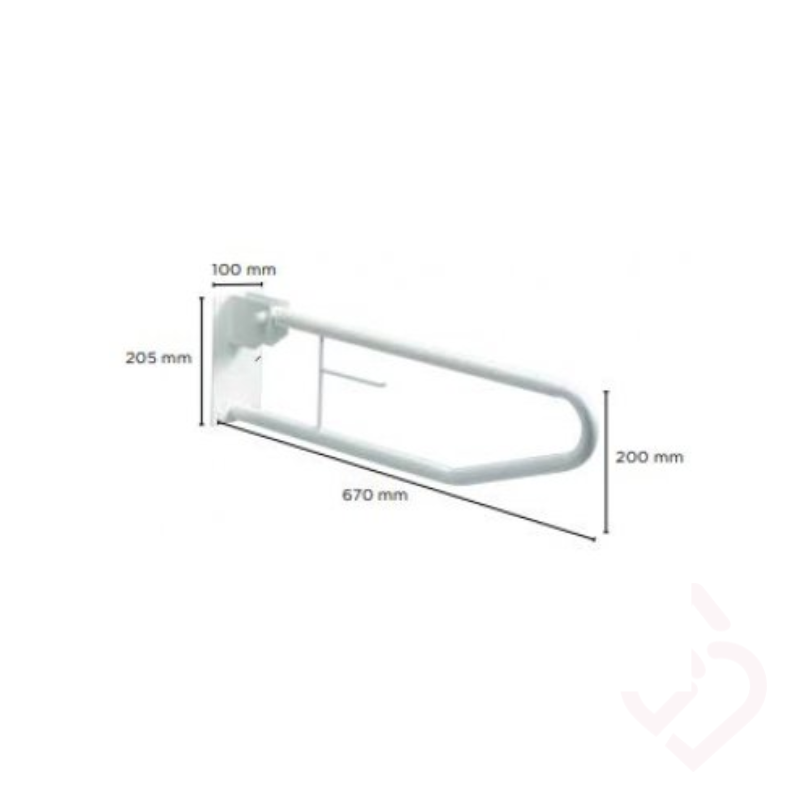 A barra é instalada lateralmente à sanita e pode ser rebatida para a posição vertical quando não está a ser utilizada, permitindo poupar espaço. Quando utilizadas duas barras, uma de cada lado, facilita a transferência para a sanita, incluindo em situações de utilização de cadeira de rodas. Inclui ainda suporte para rolo de papel higiénico.