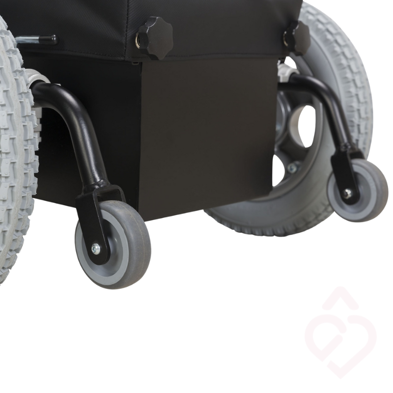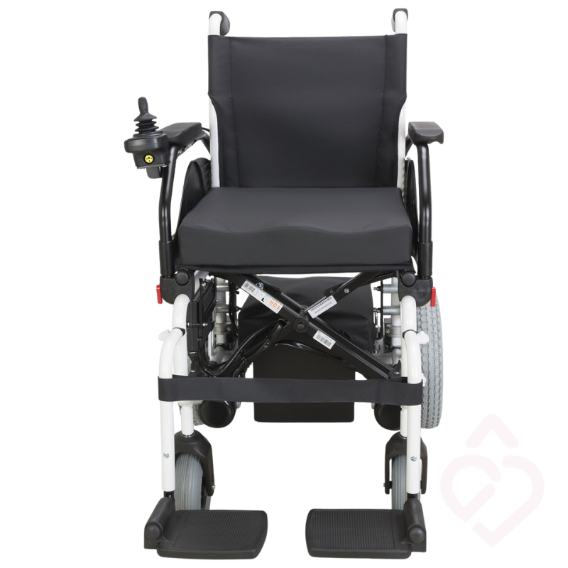 Estrutura resistente em aço, assento anatómico em espuma de memória e rodas pneumáticas proporcionam segurança e comodidade a cada deslocação. Apoios de pés e braços removíveis facilitam transferências, e as baterias destacáveis tornam o transporte e a arrumação simples e rápidos.