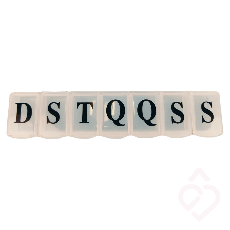 Organização semanal – Composta por 7 compartimentos independentes e transparentes, um para cada dia da semana. Cada tampa está identificada com a inicial do dia, em letras grandes e bem visíveis.