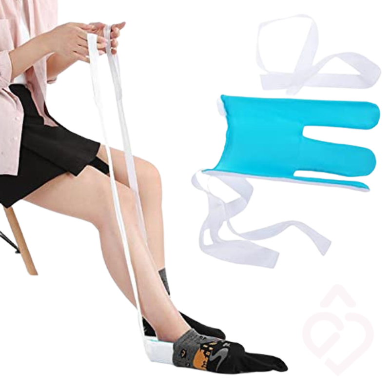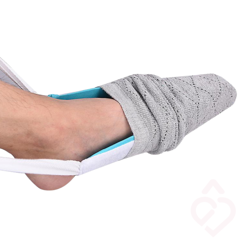 As tiras longas permitem aproximar o dispositivo dos pés e puxar a meia de forma controlada. O interior com forro em nylon facilita o deslizamento do pé, enquanto o exterior em tecido turco macio protege as meias, evitando que rasguem ou fiquem presas durante a utilização.