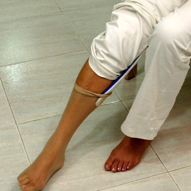 Possui tiras longas que ajudam a aproximar o dispositivo dos pés e a puxar a meia de forma controlada