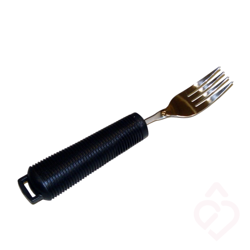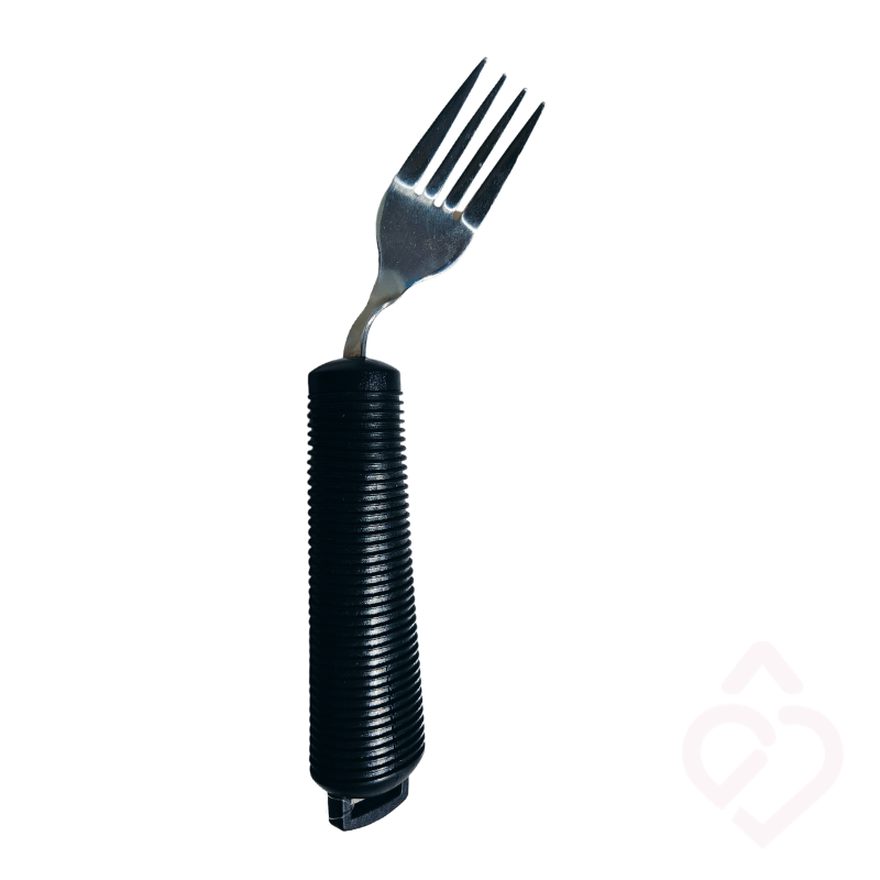 O garfo pode ser moldado lateralmente para a direita ou para a esquerda, ajustando o ângulo conforme a necessidade do utilizador. Possui cabo ergonómico engrossado, revestido a borracha macia e antiderrapante, que melhora a preensão e reduz o esforço durante a refeição. Fabricado em aço inoxidável resistente e fácil de limpar.