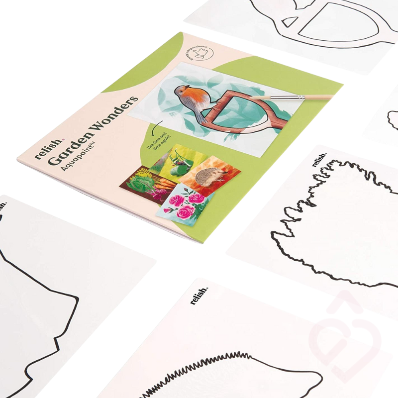 Aquapaint – Conjunto de 5 imagens diferentes com o tema maravilhas do jardim, que são pintadas apenas com água. As imagens surgem ao contacto com a água e desaparecem após secar, permitindo reutilização contínua.