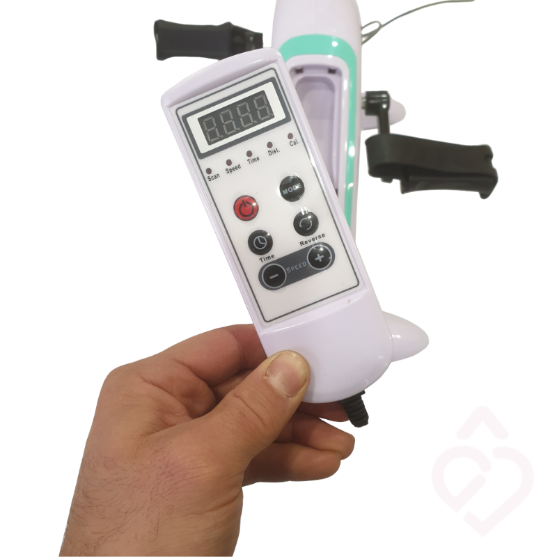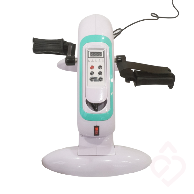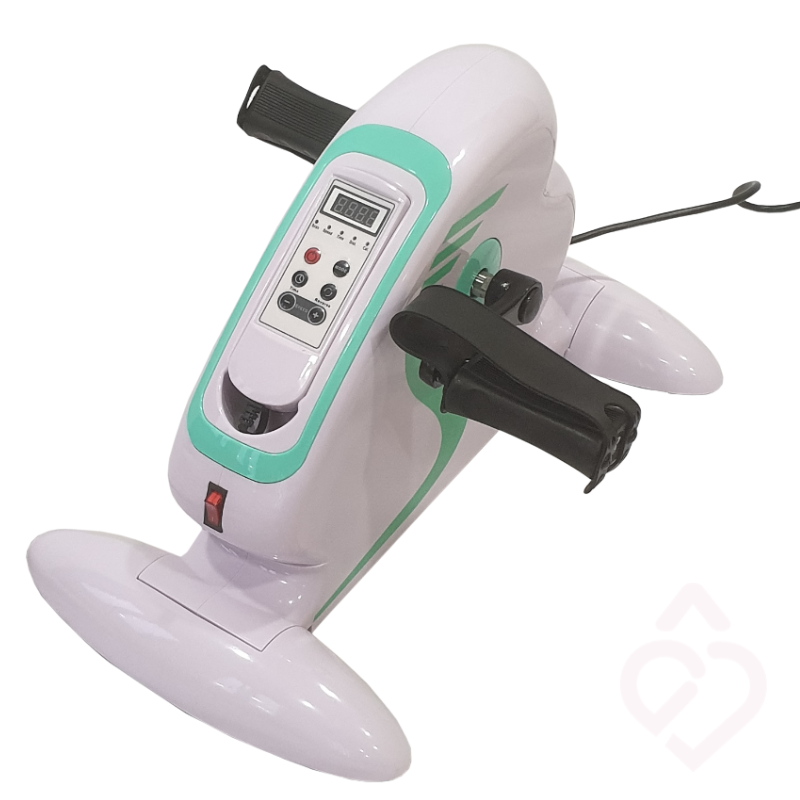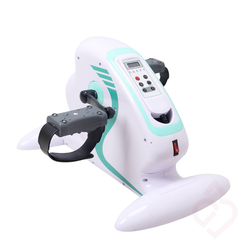 Pedaleira elétrica para exercitar braços e pernas em casa, apoiando rotinas de reabilitação e manutenção. Permite pedalar com ajuda do motor para exercício passivo ou de forma manual para exercício ativo, em ambos os sentidos, para a frente e para trás