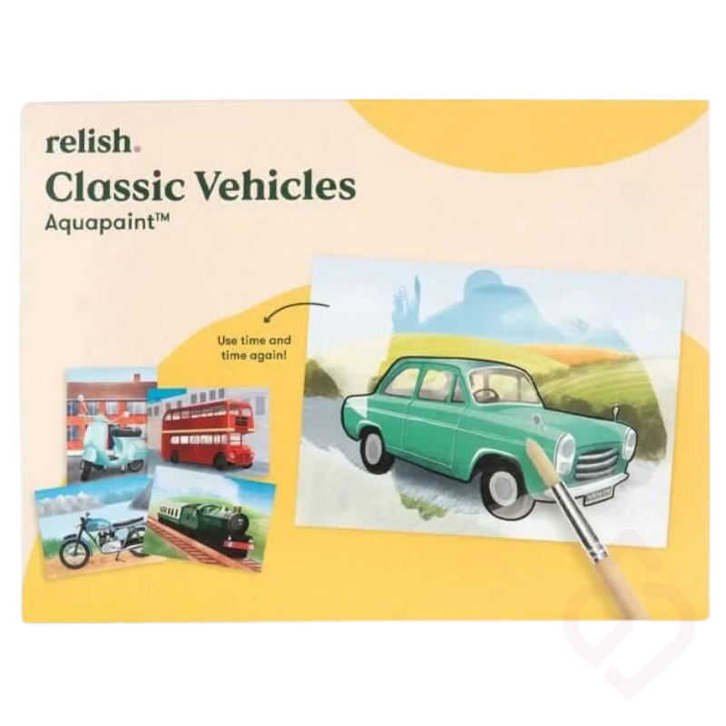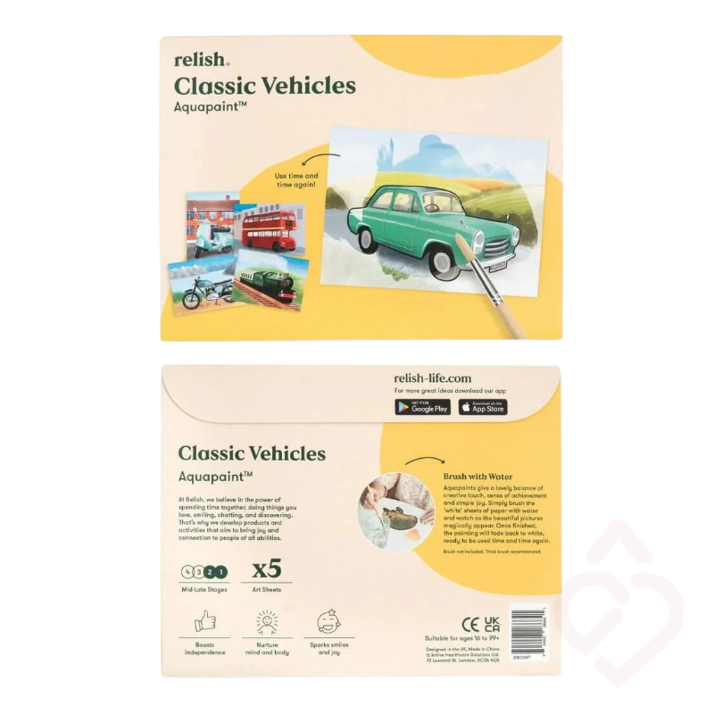 O Jogo de Pintura com Água “Veículos Clássicos” inclui 5 imagens de automóveis antigos para pintar apenas com água, usando pincel ou dedos. As cores surgem ao aplicar água e desaparecem ao secar, permitindo reutilização ilimitada. Esta atividade promove relaxamento, estimula a criatividade e desperta memórias e conversas sobre a história dos veículos clássicos, sem necessidade de tintas.