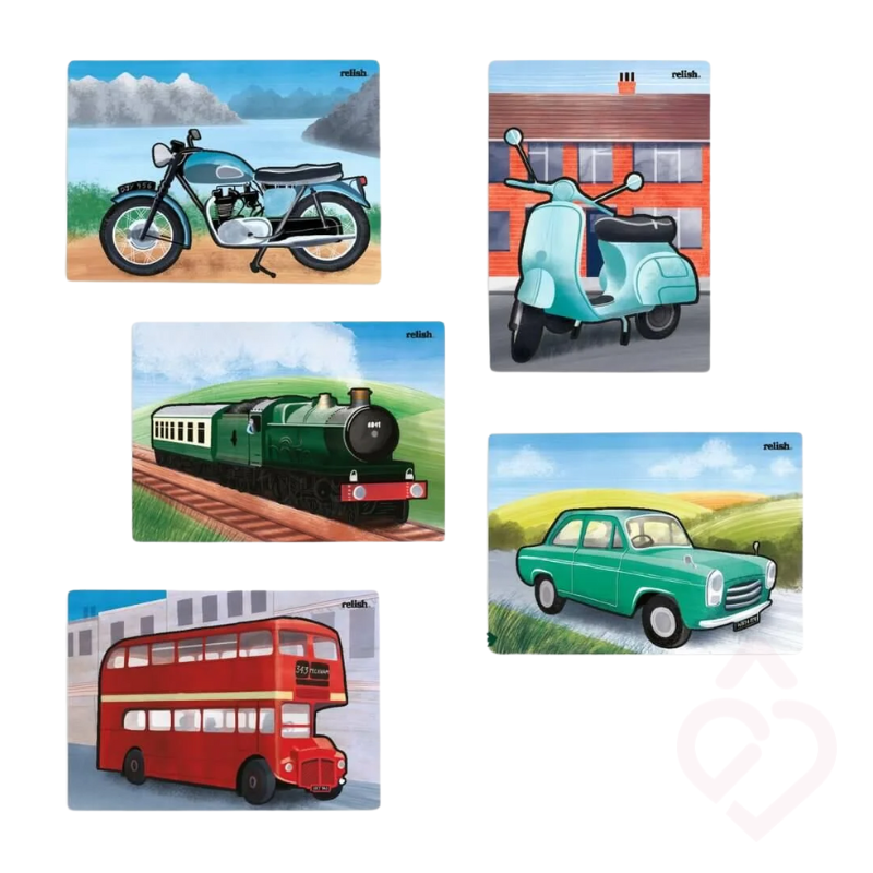 Imagens incluídas – cinco imagens inspiradas em vículos clássicos que despertam interesse e conversa. Carros, autocarro de dois andares e uma vespa