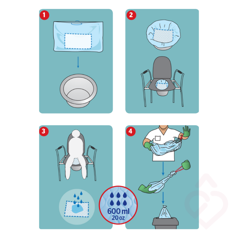 Útil – sacos descartáveis com absorvente para colocação nos bacios das cadeiras sanitárias. São úteis para recolher urina e fezes, neutralizar odores e descartar de forma segura e limpa