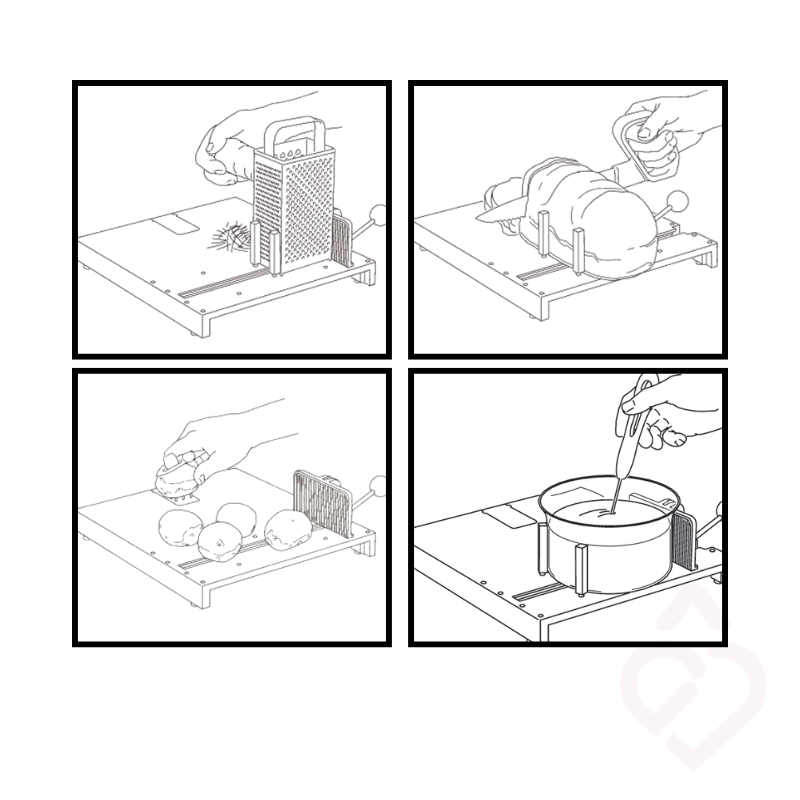 Fixações – inclui ganchos que seguram tigelas, raladores e alimentos, permitindo trabalhar com mais controlo e segurança